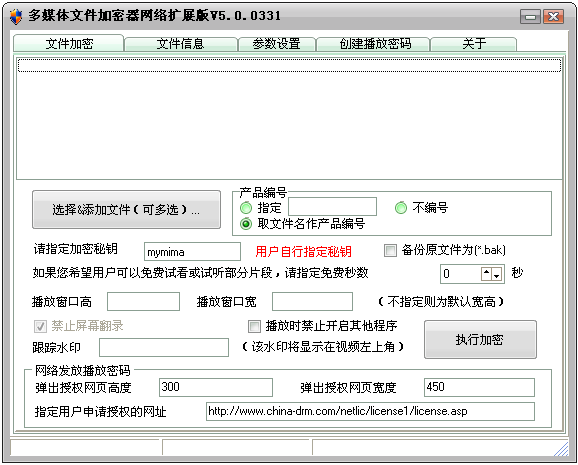 高级版包含离线授权版的所有功能,并增加以下功能: 同时支持离线授权和网络授权,可以增加记费和会员验证功能, 商家可以指定用户申请授权的网址,并可以自定义页面的高和宽; 开放接口,接口灵活,商家可以在服务器端进行会员验证和记费等操作,同时可以网络方式或离线方式向用户发播放密码,无须人工参与!用户无须任何升级,*大化的简化用户操作。 支持所有格式多媒体文件加密(avi,mpeg,wmv,asf,rm,rmvb.......) ! 可以根据用户需求定制相关功能! 是校园网、企业网、网吧内数字版权保护解决方案!查看方案介绍 提示:如果您加密的是rm或者rmvb等real格式,请确认你已经安装了realone解码器,realone解码器下载地址