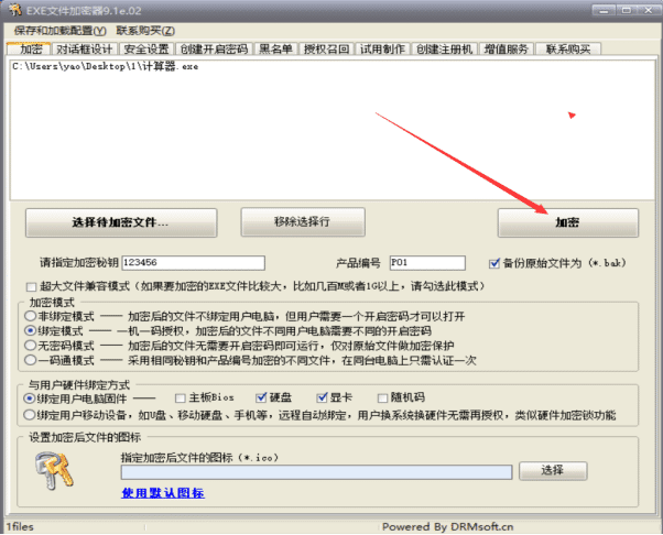 第1步:打开加密软件,选择要加密的文件,选择软件运行的主程序,就是您的软件打开时需要运行的那个主程序exe 第2步,设置一个自己的加密密钥,试用版无法修改加密密钥,正式版可以设置一个自己的加密密钥,加密密钥的作用是用来对文件进行加密,加密后的文件需要开启密码打开,只有知道加密密钥的人才可以创建开启密码,开启密码不是加密密钥,开启密码是通过加密密钥和用户的机器码通过一定的加密算法生成的,这样加密后的文件就可以和用户电脑硬件绑定,实现一机一码的加密效果:
